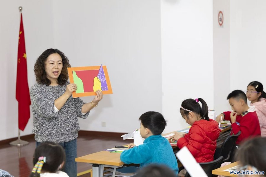 “山水画里的上海”少儿艺术工作坊则以上海博物馆馆藏元代绘画作品《淀湖送别图》为灵感,融入当代创意——利用“三远法”分解空间层次,将皴法转换为装饰语言,制作山水拼贴画。在创作过程中,孩子们边欣赏古代上海地区的自然风光,边将自己的认知理解融入艺术表达。如,一名四年级小学生联想到古诗“千里黄云白日曛”,将黄色卡纸剪成云朵形状;一名三年级小学生将上海地标东方明珠与山水并置,体现跨越时空的文明对话。