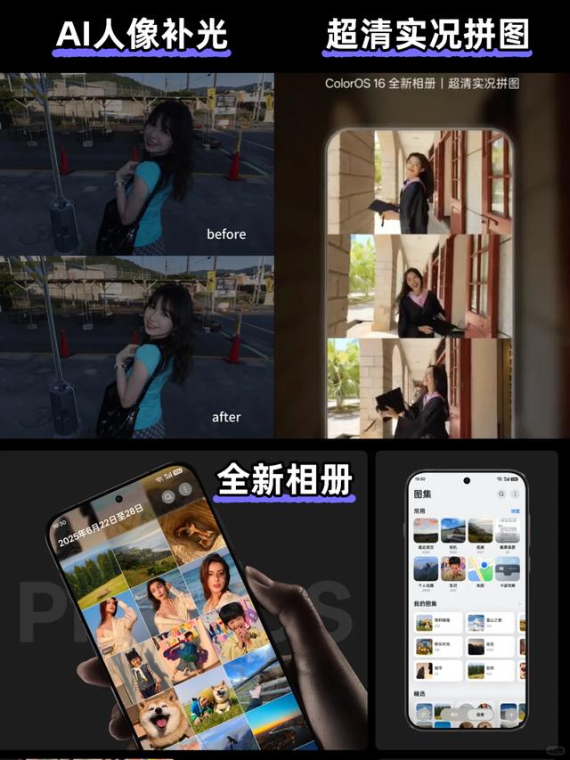 在功能方面,ColorOS 16目前公布了不少新功能,比如提升录音清晰度、把待办挪进了日历、便签有更多AI功能;新的光场设计新桌面图标有自己的特色、变得更好看了;相册也是大焕新,新加入AI人像补光、超清实况三拼图,对于喜欢拍照的用户来说后期修图又省了不少功夫。