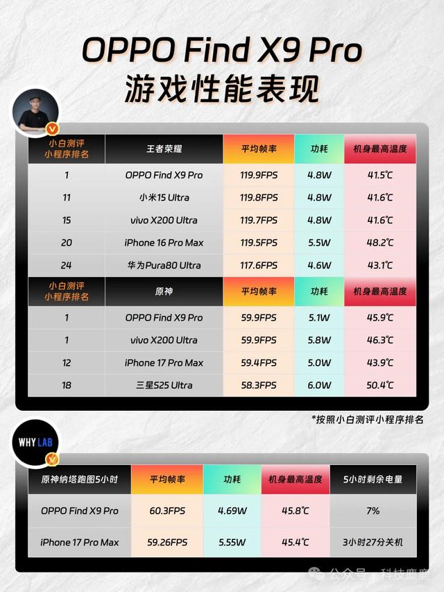 性能方面,落地到游戏实测,OPPO Find X9 Pro的表现还是可圈可点的。小白测评里无论是王者荣耀还是原神,都能轻松跑到接近满帧且更低功耗的表现,果然天玑上限看OPPO是没错的。
