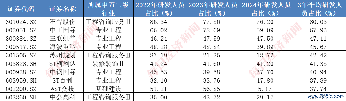 每经资本眼研究员观察发现,研发投入占营业收入比重、研发人员数量占比与建筑行业上市公司的市值表现和业绩表现之间并无明显关联。市值方面,研发投入占营业收入比重和研发人员数量占比靠前的建筑行业上市公司,市值普遍偏小。截至2025年5月23日,A股建筑板块共有164家上市公司,板块市值合计为1.74万亿元,而最近三年平均研发投入占营业收入比重排在前十名的上市公司市值合计为500.34亿元,占整个建筑板块市值的比例不到3%;最近三年平均研发人员数量占比排在前十名的上市公司市值合计为389.68亿元,占整个建筑板块市值的比例仅2.24%。
