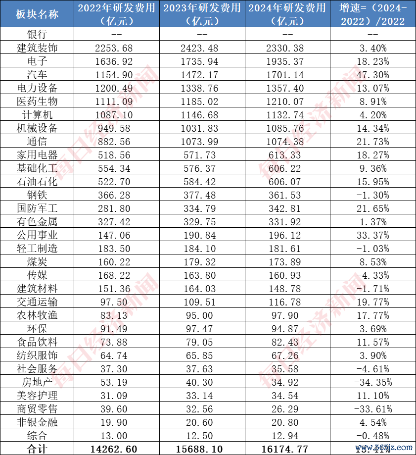 同花顺iFinD数据显示宏基资本,2022年至2024年,A股上市公司合计研发费用整体呈现稳步增长态势,分别为1.43万亿元、1.57万亿元和1.62万亿元。相较2022年,2024年A股上市公司研发费用增速达到13.41%。值得注意的是,银行板块和部分非银金融公司并未公布其具体研发费用数据,因此A股上市公司实际研发费用要高于每经资本眼研究员梳理的数据。