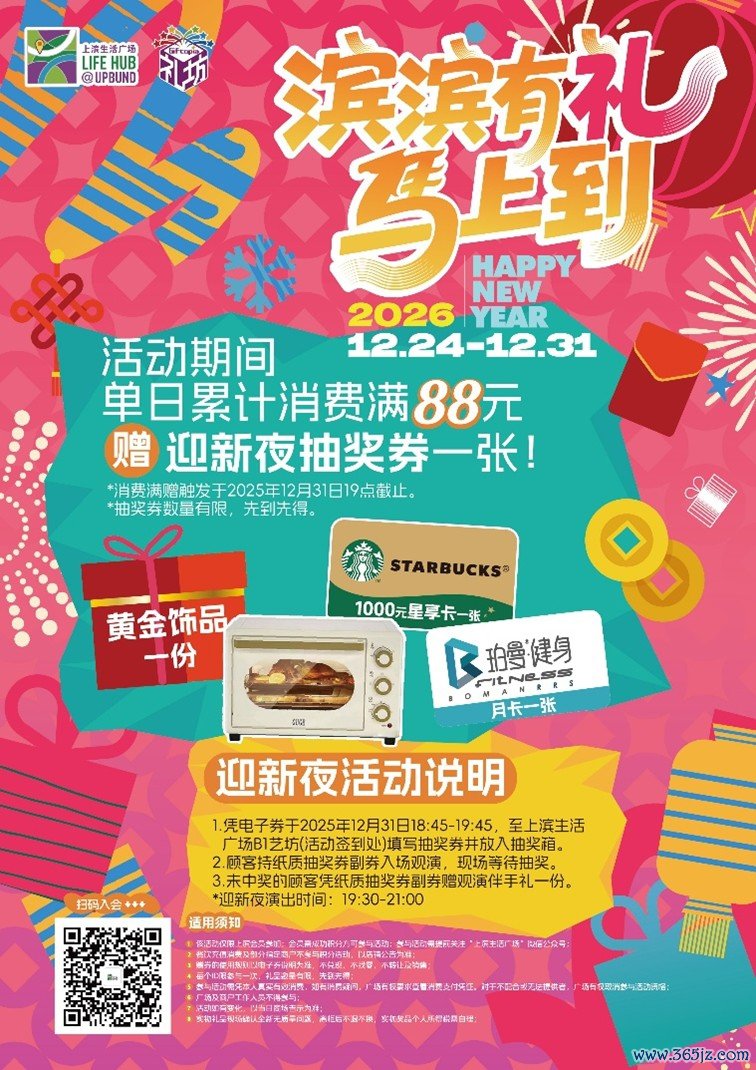“迎新夜”嗨购促销,是主题活动的另一亮点。即日起至12月31日,在上滨当日累计消费满88元并成功积分,即可获得迎新夜抽奖资格,礼品包括黄金饰品、星巴克星享卡、礼坊新年礼品、珀曼健身月卡等。